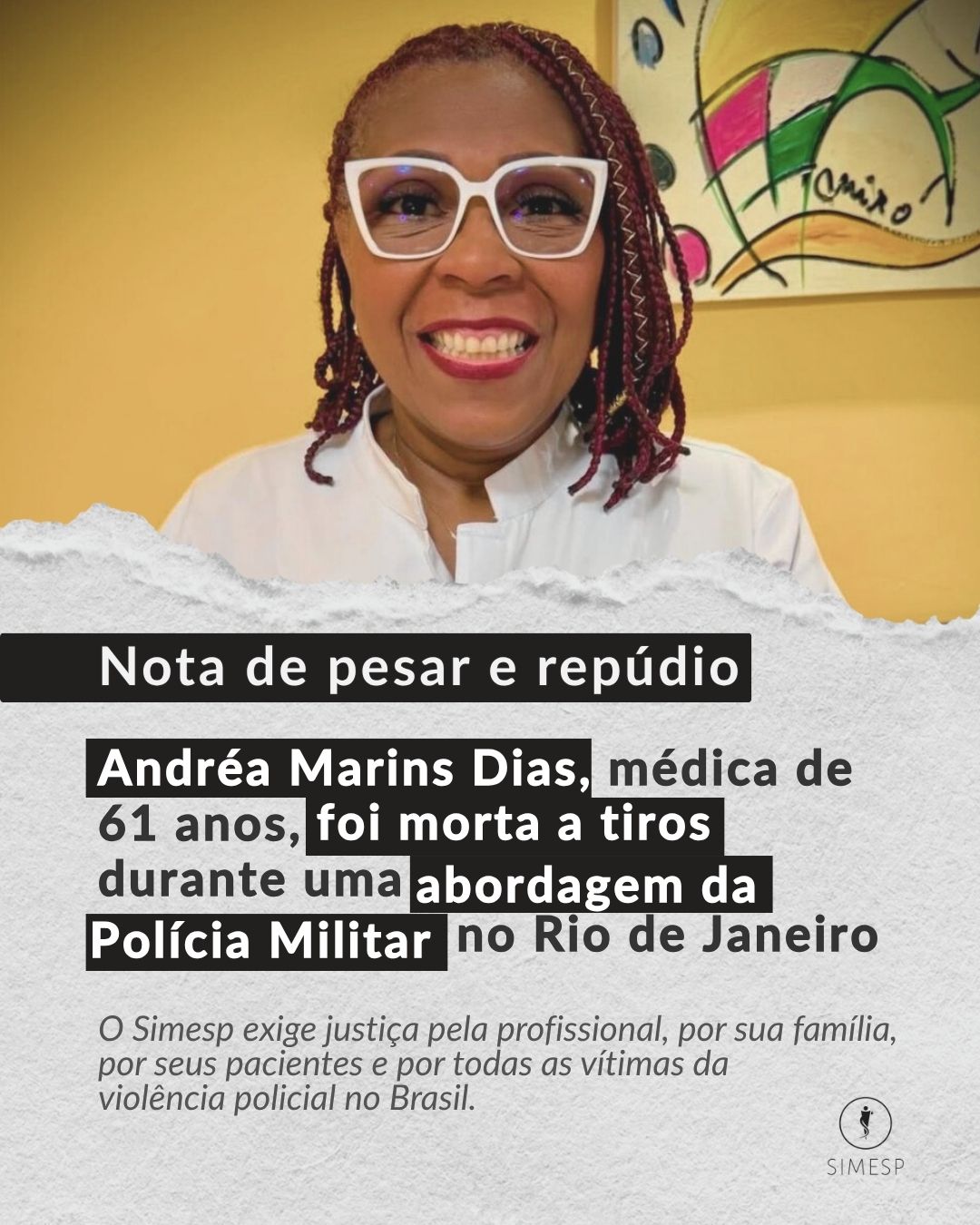 O Sindicato dos Médicos de São Paulo (Simesp) manifesta profundo pesar e indignação diante do assassinato da médica Andréa Marins Dias, de 61 anos, ginecologista e cirurgiã-geral, assassinada a tiros durante uma abordagem da Polícia Militar no Rio de Janeiro no último domingo, dia 15 de março.