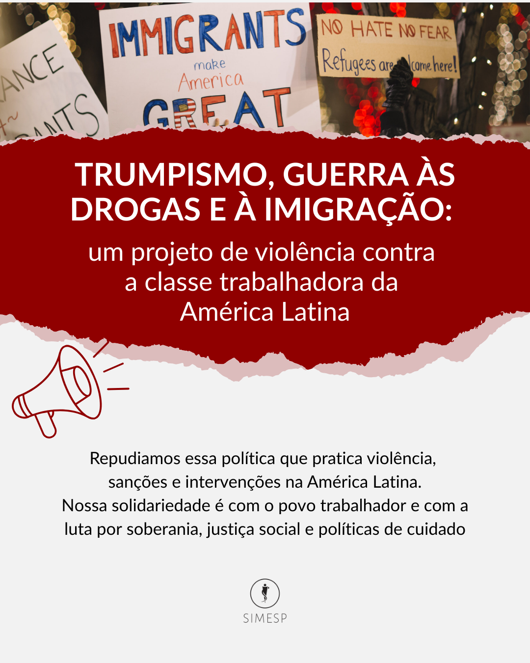 Tendo em vista o cenário devastador, o Simesp manifesta sua solidariedade internacional ao povo trabalhador, sobretudo aos venezuelanos, que vem sofrendo diante da intensificação da ofensiva liderada pelos Estados Unidos, impulsionada pelo imperialismo trumpista, e por uma política externa marcada pela violência, pelo racismo e pela criminalização de povos latino-americanos.