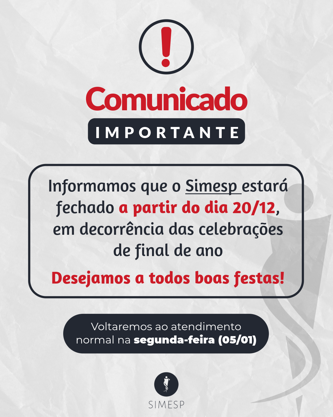 O Sindicato dos Médicos de São Paulo (Simesp) informa que estará em recesso a partir do dia 20 de dezembro, em razão das celebrações de final de ano.