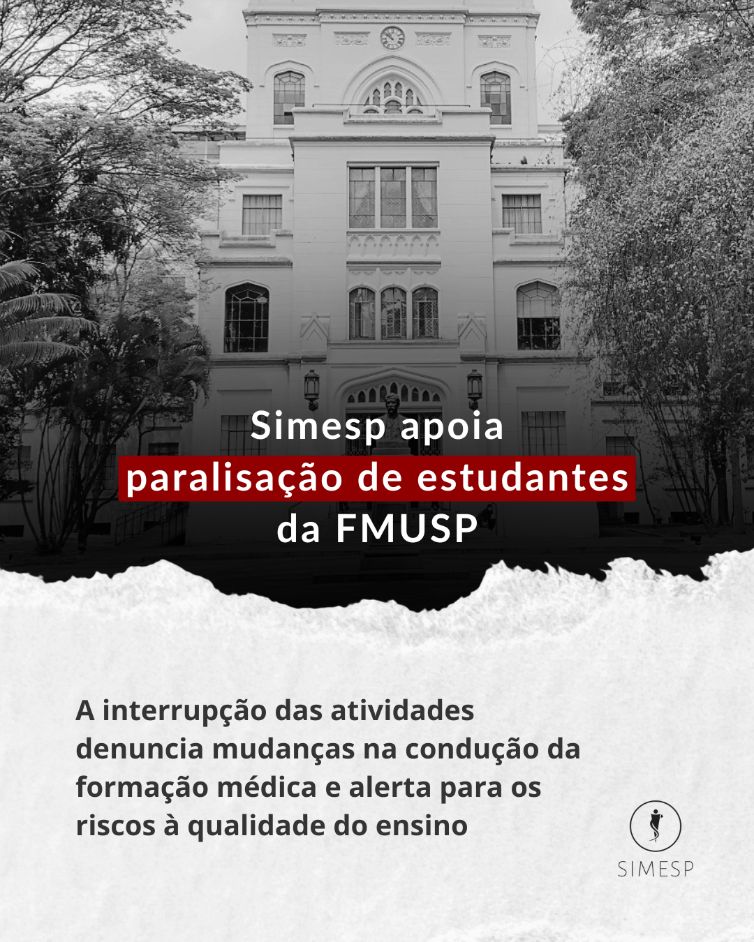 O Sindicato dos Médicos de São Paulo (Simesp) manifesta apoio à paralisação dos estudantes da Faculdade de Medicina da Universidade de São Paulo (FMUSP), que vêm denunciando mudanças recentes na condução da formação médica e alertando para os riscos à qualidade do ensino e ao caráter público da universidade. A suspensão das atividades ocorre nesta terça-feira dia 14 de abril.