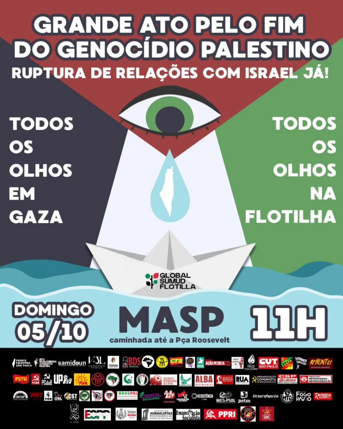 Exigimos a imediata intervenção do governo brasileiro em defesa da libertação dos reféns e convocamos todas e todos a participarem do Grande Ato em Defesa da Palestina, neste domingo, às 11h, em frente ao Museu de Arte de São Paulo (Masp), na Avenida Paulista.